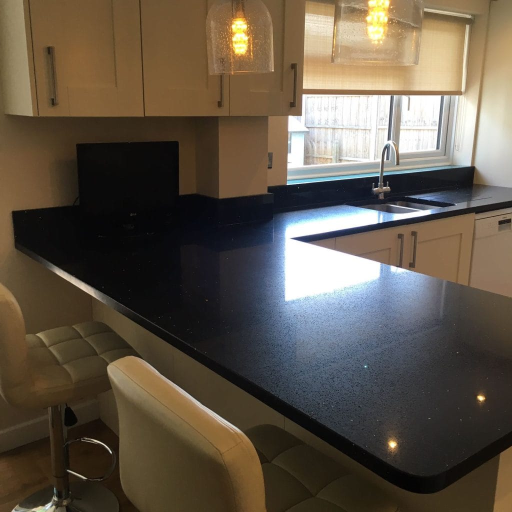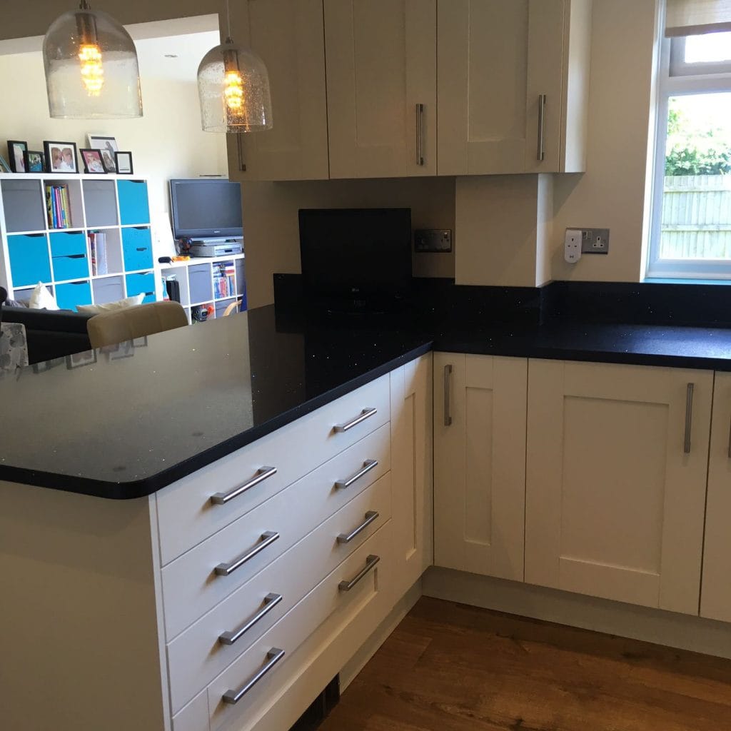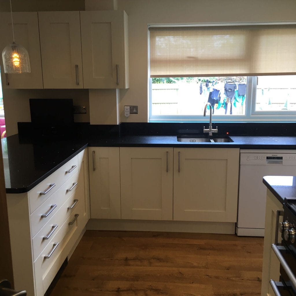 They selected real wood shaker style doors and cabinets painted in ivory accessorised by the contemporary brushed chrome D Handles, to contrast and highlight luxurious shimmering Black Silestone worktops and upstands.