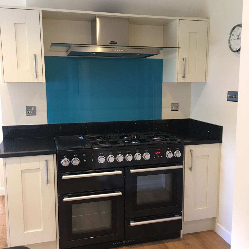 A modern blue glass splashback behind their black Rangecooker injects bold bright colour tones to make this a beautiful, modern and fun kitchen for their family. The stainless steel undermount sink and co-ordinating swan neck chrome mixer tap offers increased functionality and flexibility to their kitchen giving a harmonious overall impression.